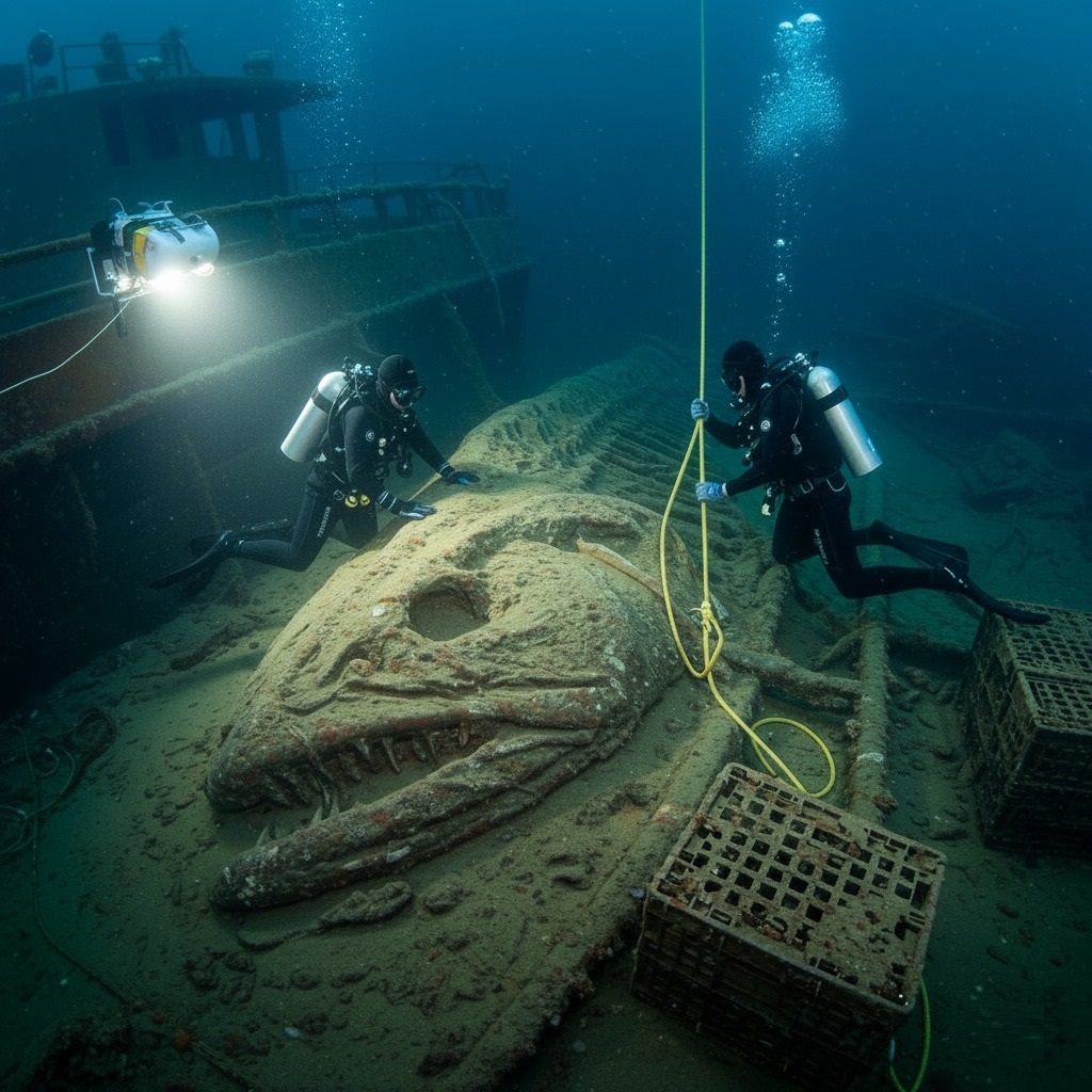 Descending through the tranquil blue, Dr. Elara Vance, lead archaeologist, and her colleague Ioannis Kouris followed their dive lights toward the wreck site. Amphorae lay scattered like frozen echoes of trade long past, their curved forms dusted with centuries of silt. But a few meters beyond the ship’s ribs, half-buried in sediment, a colossal shape broke the seabed’s smooth monotony.