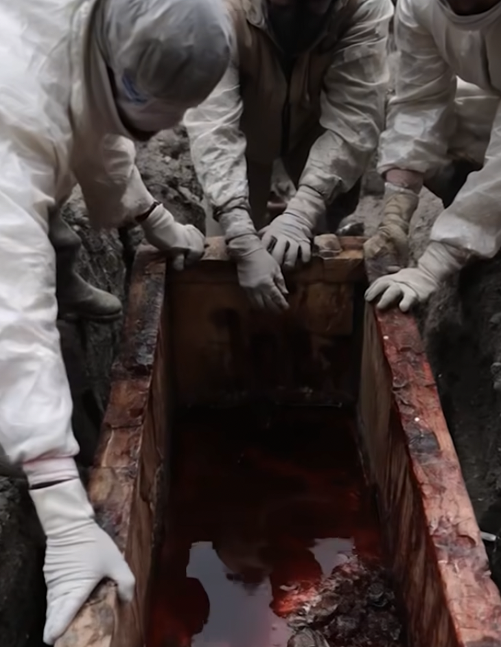 As scientists extracted samples of the liquid for testing, rumors began spreading online. Some speculated that the fluid was a magical elixir meant to preserve the bodies. Others believed it to be evidence of an ancient plague, its victims sealed away to prevent contamination. In reality, laboratory results would later show that the “red liquid” was simply a mixture of sewage water and decomposed remains that had seeped into the sarcophagus over centuries. Still, the public fascination could not be contained. Images of the eerie discovery flooded social media, fueling debates, theories, and even calls for the “mummy juice” to be studied—or jokingly, consumed.