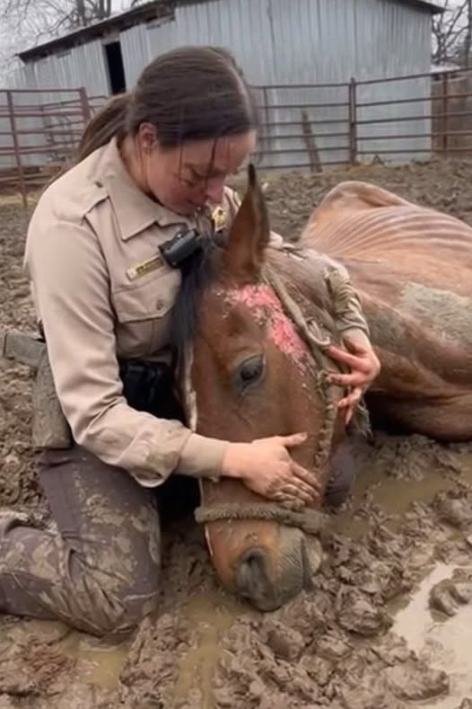 The morning mist still clung to the countryside when Deputy Erin Gibbs stepped out of her vehicle, her boots crunching over frost-touched grass. The quiet surroundings gave no hint of the urgency that had brought her here, only the distant calls of birds waking with the first rays of sun. But Erin’s heart was pounding. She had received a call just minutes earlier: a mare on a remote property had been found unable to stand, lying in cold, thick mud. The neighbor who reported it sounded shaken, describing the horse as exhausted and too weak to rise.