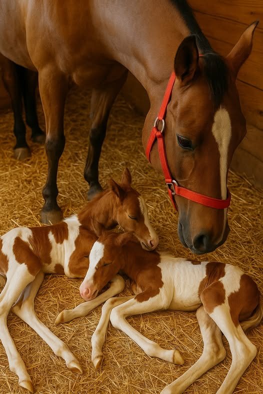The morning began like any other on the quiet pasture, where the sunlight softened the rolling hills and the air was calm enough to feel like a soft welcome. But something extraordinary was waiting beneath the shade of the old oak tree. A mare, known for her gentle nature and calm strength, stood protectively over not one newborn foal—but two. Their small bodies rested close together, still adjusting to the brightness of the world around them.