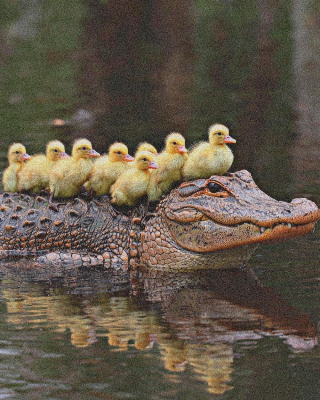 Out from the reeds glided a crocodile, one of nature’s most ancient and powerful creatures. Its broad, ridged back cut silently through the current. But perched atop it, nestled close together, was a group of ducklings — tiny, fluffy, and impossibly fragile. They balanced effortlessly, riding across the river on the back of a reptile that could, in theory, have been their greatest threat.
