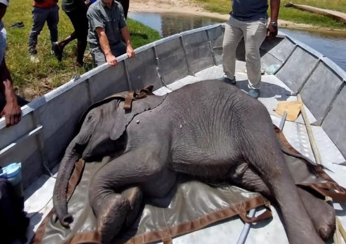 The solution came in the form of the Flaxmans’ small boat. With patience and teamwork, the rescuers secured the vessel and carefully positioned the calf inside. As the boat pushed off from the bank, the scene was both humbling and unforgettable — a group of people united by compassion, ferrying an orphaned elephant across the shimmering waters of the Delta toward safety.