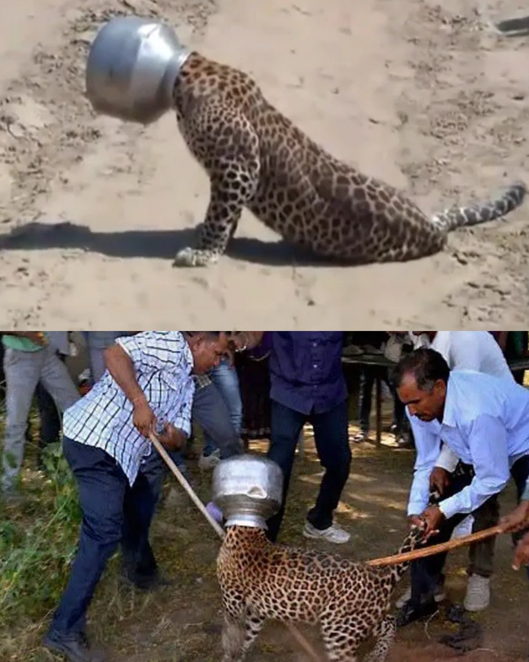In a quiet village in India, the dawn of a seemingly ordinary day quickly gave way to chaos, curiosity, and concern. Residents were roused from their morning routines by a commotion unlike any they had witnessed before — a leopard had wandered into the settlement. Initial panic and confusion rippled through the narrow streets as villagers tried to understand the unusual visitor. But as they approached, they discovered something both startling and strangely amusing: the young leopard had its head stuck inside a metal pot.
