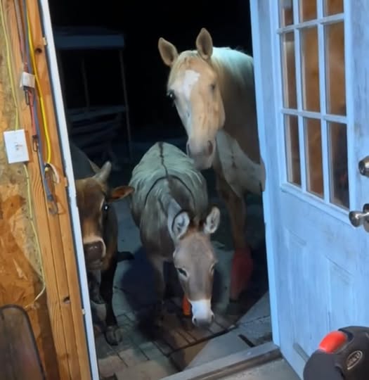 Just as they were settling in, a loud sound came from the back door. Curious and a bit startled, they peeked outside. There, standing under the dim porch light, were their neighbors’ animals—the horse, the cows, and even the old donkey—all gathered together. Somehow, the creatures had jumped their gates and made their way across the fields to the couple’s home, as if drawn by a shared instinct or silent invitation.