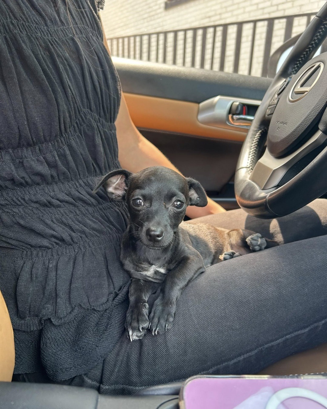 Yesterday, during a routine work errand, a tiny face caught my eye—peeking out from under a car, trembling and alone. A 9-week-old puppy, barely bigger than my hand, her eyes wide with fear yet brimming with hope. She was too small, too vulnerable to be out in the world on her own. My heart made the decision before my head could catch up: I couldn’t leave her there.