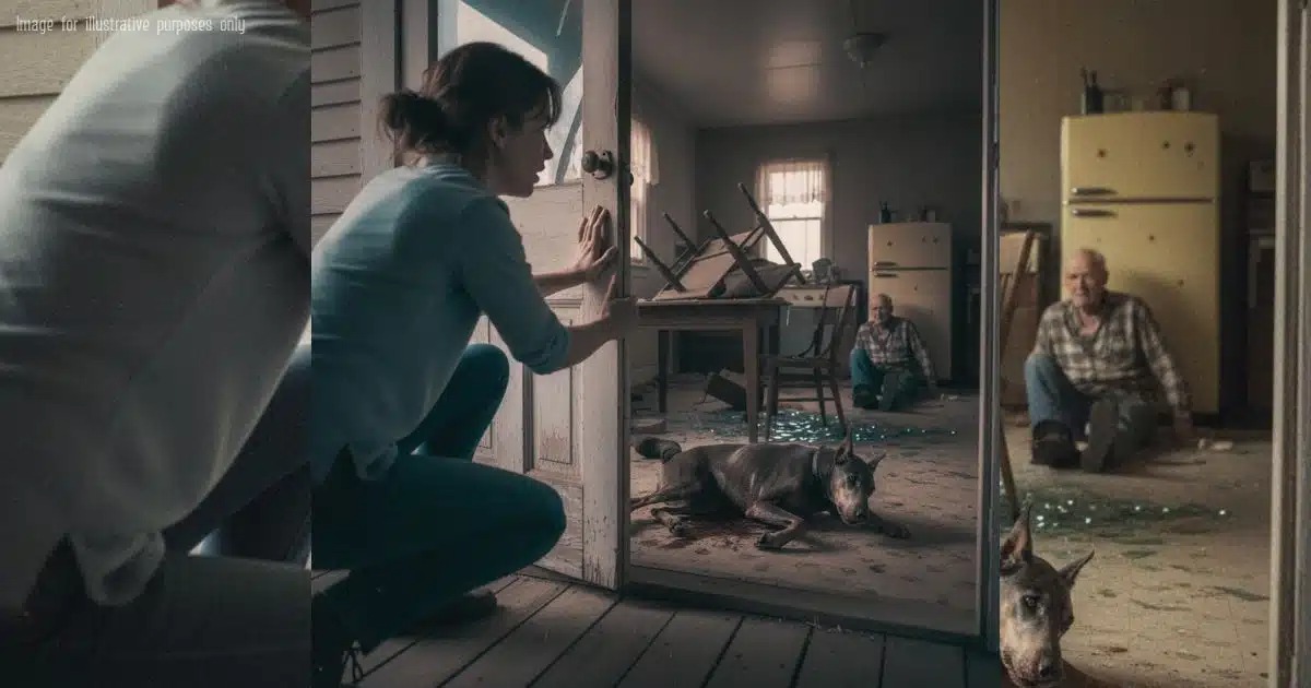 Through the narrow gap, she saw the edge of the kitchen table turned on its side, a dark boot on the floor, and a smear of red stretching toward the body of the old Doberman, chest heaving, eyes wide and shining with pain.