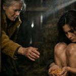 За кілька кроків від входу стояла дівчинка, ледь вийшовши з підліткового віку. Вона була болісно худою, у надто великій куртці, яка сповзала з вузьких плечей, наче була знята з когось іншого. Туфлі — в пилюці й землі, волосся нашвидку зібране назад, а вибиті пасма обрамляли обличчя — надто серйозне для її років.